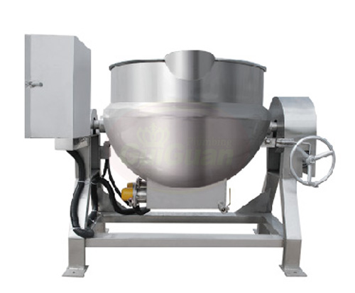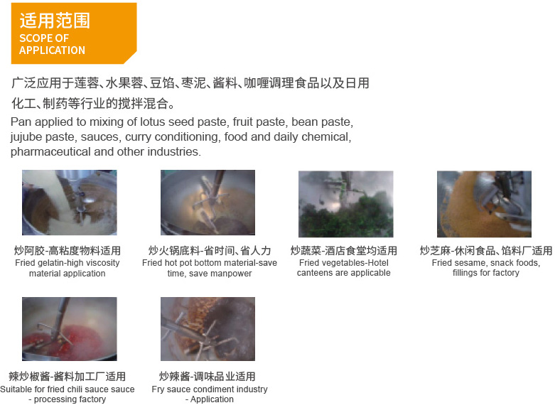 本產(chǎn)品鍋體為一次沖壓成型的半球不銹鋼鍋體,采用電加熱、蒸汽加熱、燃?xì)饧訜?攪拌方式采用特殊的傾斜傳動,使用的行星攪拌器與鍋體充分接觸,實現(xiàn)傳動公轉(zhuǎn)與自轉(zhuǎn)的不整數(shù)傳動比,使鍋內(nèi)無攪拌死角。使用先進的傳動與密封結(jié)構(gòu),使傳動部分與鍋內(nèi)潔凈、衛(wèi)生。采用變頻調(diào)速動力,運行更平穩(wěn)。電磁加熱形式打破了明火烹調(diào)方式,具有升溫快、無明火、無煙塵、無有害氣體,對周圍環(huán)境不產(chǎn)生熱輻射,安全性好和外觀美觀等特點,是性能優(yōu)良的食品加工設(shè)備。